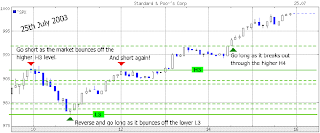 The second way to try day trading with the Camarilla Equation is to regard the ‘H4’ and ‘L4’ levels as ‘breakout’ levels – in other words to go WITH the trend if prices push thru either the H4 or L4 level. This essentially covers all the bases – Day Trading within the H3 and L3 levels enables you to capture all the wrinkles that intraday market movement throws up, and the H4 – L4 breakout plays allow the less experienced trader to capitalise on relatively low risk sharp powerful movements. Here’s what it looks like in action:-