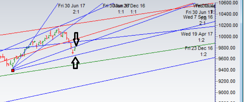 - As discussed in last analysis If 9792 get broken tomorrow we can see fall towards 9700/9642/9619. Bullish above 9820 for a move towards 9870/9960. From 10090 we have seen the fall till 9685 and saw a small pullback towards 9790, Monday close is very crucial as its was at the gann angle resistance,same happened before the fall from 10000, so bulls need to close above 9800 for next move towards 9855/9910/9962. Bearish below 9770 for a move towards 9710/9650/9610. Bank Nifty rallies 400 points from Time Cycle Low