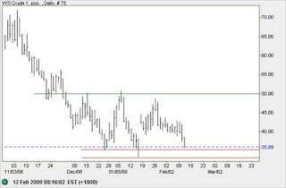 West Texas Crude is testing the band of support between $33 and $35/barrel. A close below $35 or intra-day break below $33 would warn of a down-swing to test the 2003 low of $20. The target is calculated as 35 – (50 – 35).