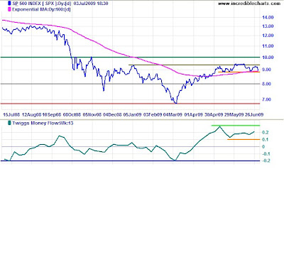 The S&P 500 is similarly headed for a test of support at 880. Breakout would test primary support at 670. Reversal above 950 is now unlikely, but would signal a primary up-trend with a target of 1100. Bearish divergence on Twiggs Money Flow (21-Day) warns of selling pressure, but the longer-term (13-Week) indicator is more evenly balanced: a fall below 0.1 would confirm the down-swing, while a rise above 0.3 would indicate a primary advance.