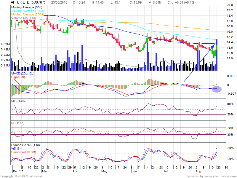 Aftek is near its resistance of 100 DMA,refer chart today volumes were extremly good in the counter and break above 100 DMA can propel stock to its 200 DMA.
