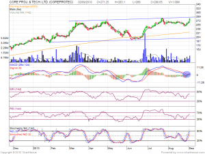 Core Projects is moving to its trend line resistance as shown in charts. MACD has given a buy signal.Stock needs to be seen how it behaves near its trend line resistance whether it breaks or hold to it.