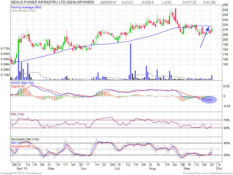 50 SMA lies at 222as stock has seen surge in volume today and MACD giving divergence,It is a buy on a close above 222
