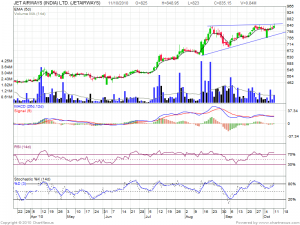 Ascending Triangle formation in Jet Airways Taking support at Lower trendline and Facing resistance at upper trendline.Breakout of the above mentioned trendline can propel the stock to higher levels
