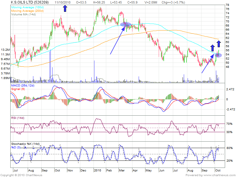 Now last trading day KS Oils was able to cross 100 DMA and move up further to close around 56 levels.Every dip till rs54 should be used to buy this stock as 100 DMA will be there to support this