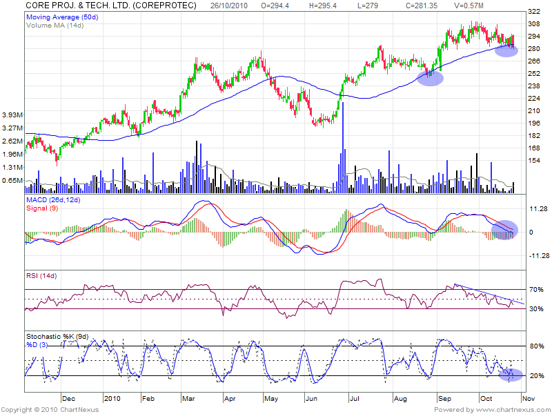 If one look at the chart of Core Project Closely we can find the imporatnce of 50 SMA .Every time the stock dip below 50 SMA it bounces back fiercly.As i have pointed on chart.