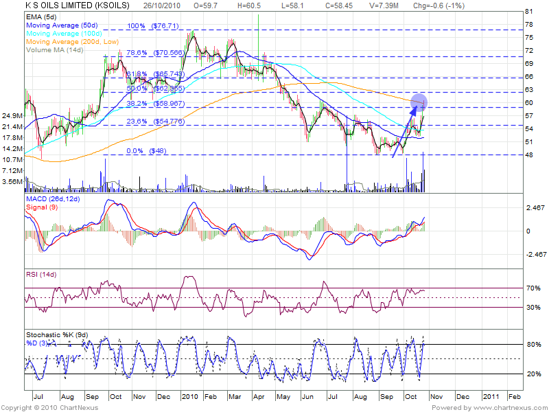 KS Oils is on a bull run from a low of Rs 48 to a break of 60 today.Today stock came near its 200 DMA and was unable to cross it.I have given call on this counter around 54 levels.