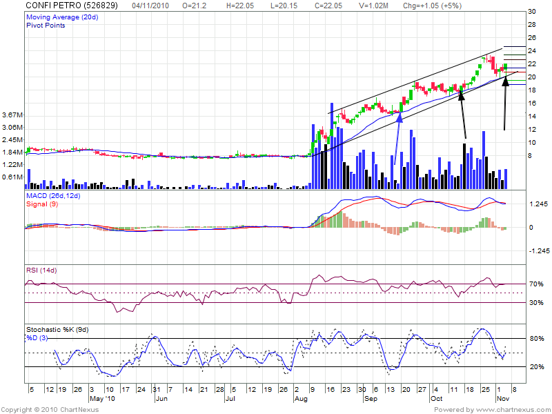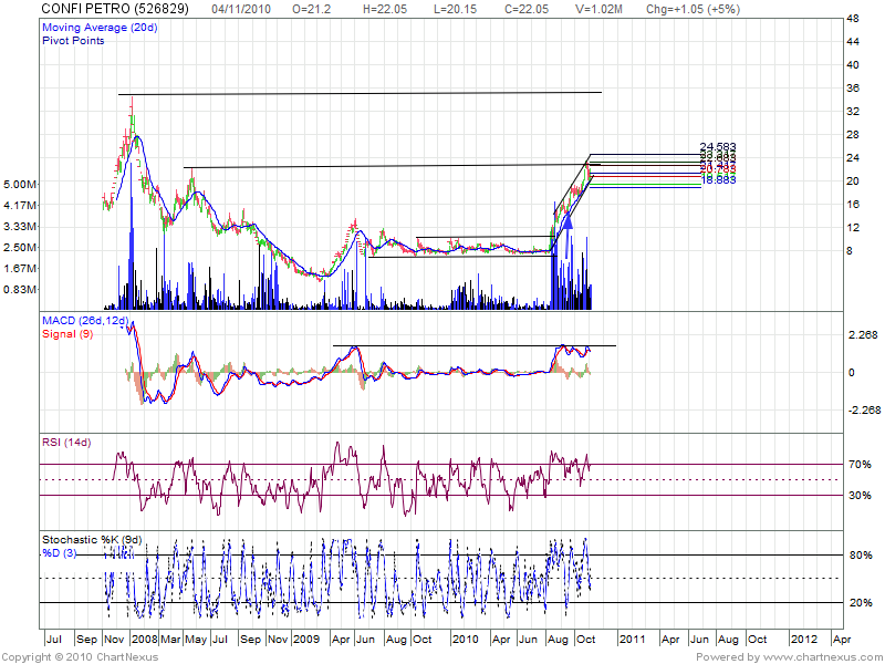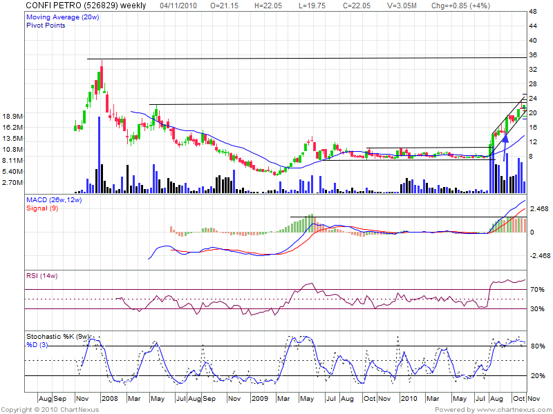 Looking at weekly chart we can see high of 23 than 25 in the present up move. Technical Indicators are overbought and can correction and consolidation should be need of hour for another round of up move.