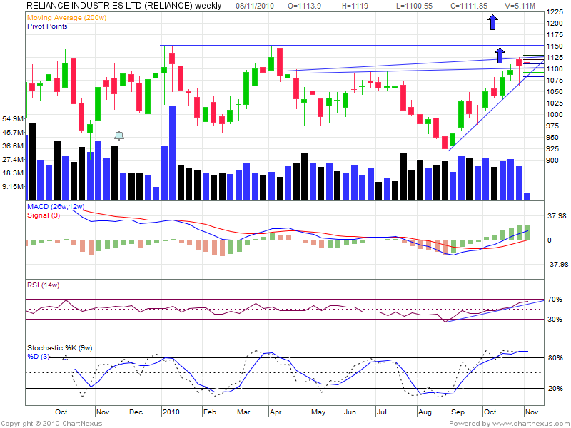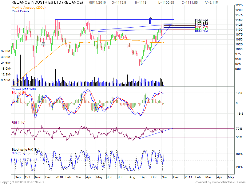 Reliance Daily Chart is showing a bullish breakout with rising support and facing resistance around 1119 levels.Stock has remain under performer for the most of the rally,Now as we are at the most crucial juncture of the rally moving to all time high RIL can play a crucial role.
