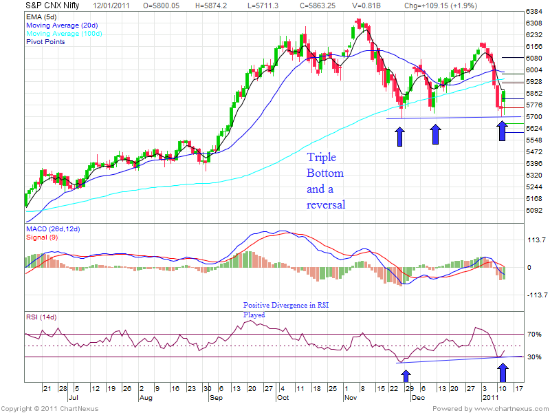 Nifty made a triple bottom at 5700 level as shown in chart and showed a pull back from the lows and rallied till 5865. Tomorrow is Infosys result at 9 AM and it will decide the further tone of market.But i would request all not to Short market now.
