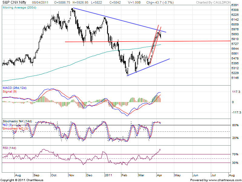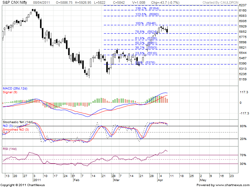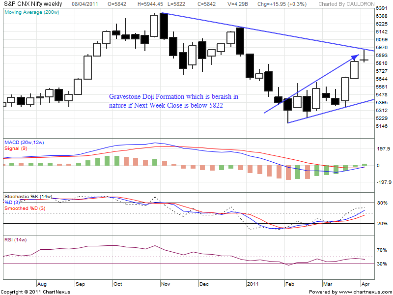 On Weekly charts we have a Gravestone DOJI pattern which is bearish in nature if next week close is below 5822 levels. Gravestone Doji is formed near a exhaustion uptrend where BULLS take the Index to higher levels but Bears are able to push index to lower levels with selling exceeding the buying. Hence its an indecision b/w BUlls and Bears about the Index further levels.