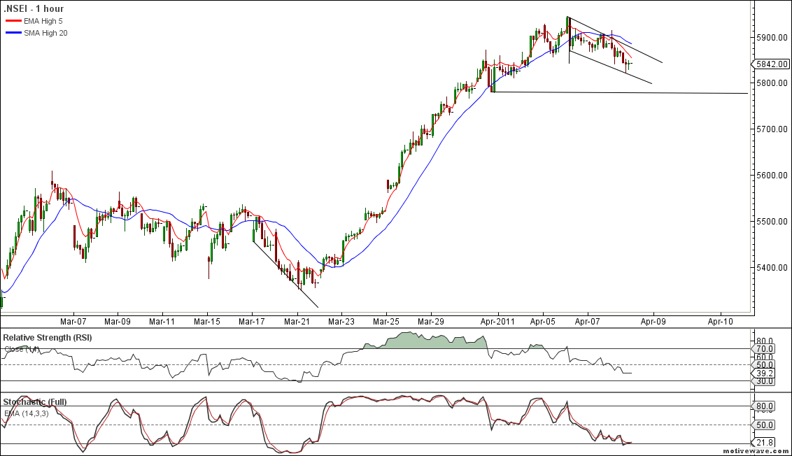 Nifty Hourly chart is giving a SELL call as per our 5 EMA and 20 SMA system.Sell was generated at 5910 levels.Hourly overbought is getting corrected and slowly indicators are moving to oversold zone. On Hourly charts Nifty is forming a FLAG pattern formation which is low of 5822 is held can move till heigh of pole ie. 68 points.