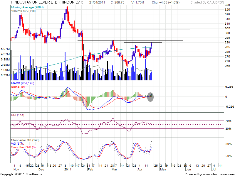 HUL has crossed above its 200 DMA with volume marking its entry in BULL region,next level of resistance is at 290.Cross over of 290 with volume can move the stock to next level