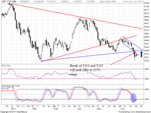 On Nifty daily chart we can see a parallel channel formation and the bottom of channel being a resistance.Break above the lower channel will take nifty to 5365 as shown in the chart.