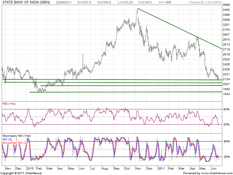 SBI is touching its long term trendline and break of 2123 can take the stock to sub 2000 levels as shown in the chart.