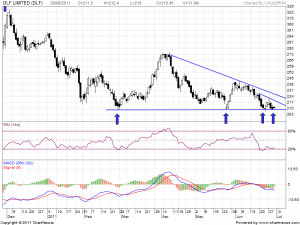 DLF is back to its lower range of 206-208 where it has bounce from past 4 times. Will it be 5th time lucky?