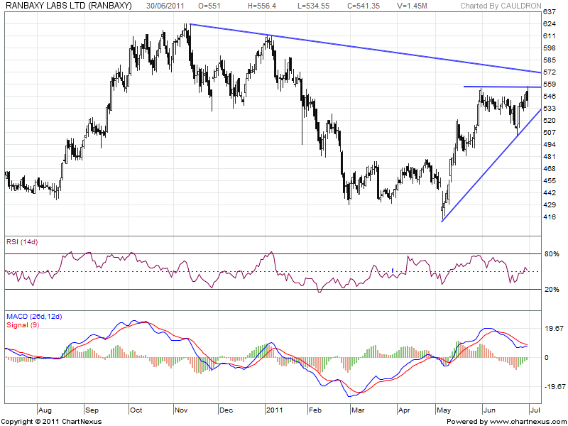 Ranbaxy is facing a resistance in the range of 554-557 break of this range can propel the stock to 570 odd levels and failure to break the range can move the stock down to 514 levels. Good range to trade for swing traders