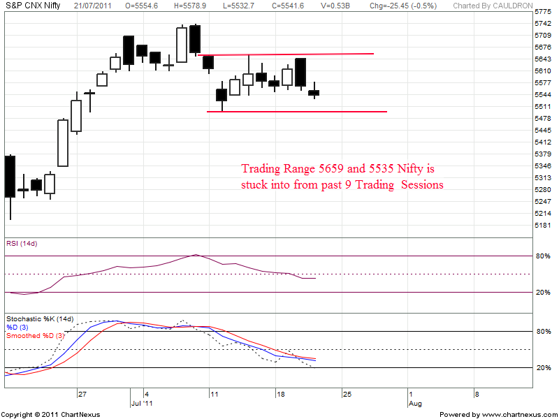 As seen from above chart from past 9 trading sessions 5659 on Upper end and 5535 on lower end is the trading range.