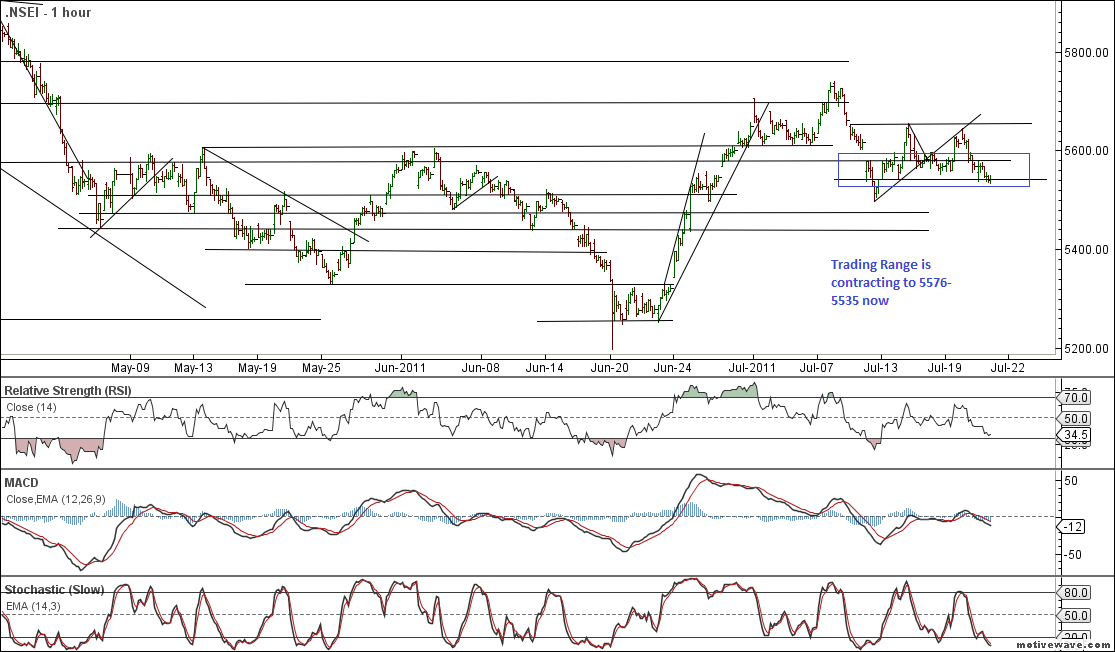 Nifty Hourly Charts are trading in small range of 5535-5576 with Hourly Indicators near Oversold Territory.Below 5535 we can see 5497 levels and above 5576 we can again trade near 5610 levels.