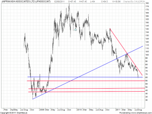 Never Catch a Falling Knife is a truism and applicable for JP Associate,Stock has been falling 101 levels and today broke the long term trendline at 65 on large volumes which is bearish for the stock.
