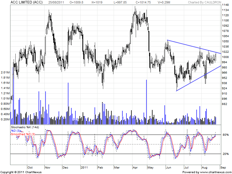 ACC has been trading in a triangle pattern and taking resistance at Upper trendline. Cement Stocks has outperformed Nifty and ACC being leader in them.