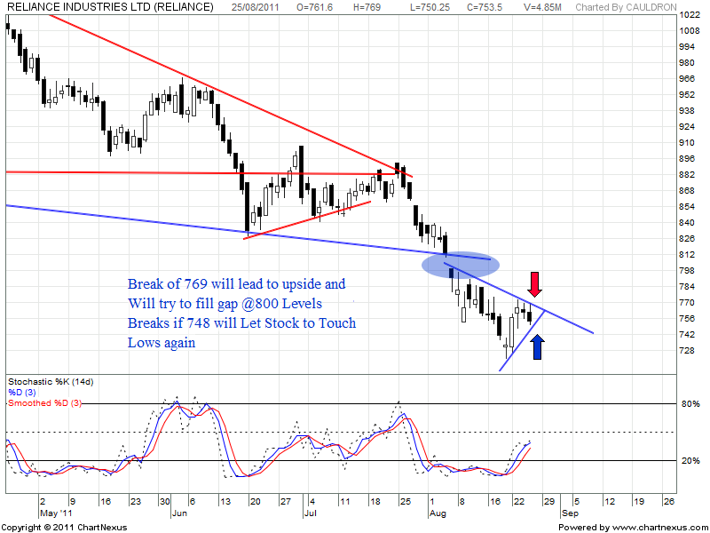 RIL on Daily chart has taken support at Lower trendline and resisting at upper trendline as shown in chart.