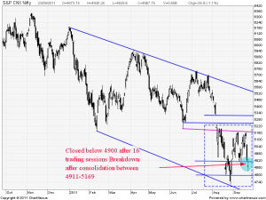 On Daily charts Nifty has closed below 4900 after 16 trading session which technically will be qualified as Breakdown out of trading range of 4911-5169.
