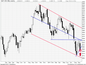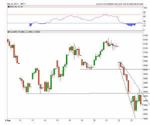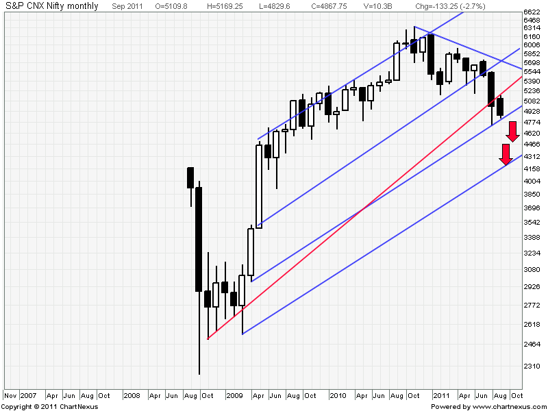 On Monthly charts Nifty broke the monthly low of 4911 after unable to break the Monthly high of 5169. Break of new low of 4830 would lead nifty to 4796 and 26 Aug low of 4720 and finally to our tgt of 4653.