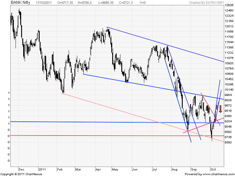 Bank Nifty has been trading in a channel after the breakout above 9363 levels,Channel low comes at 9666 Break of the same will lead the follow through selling in BN