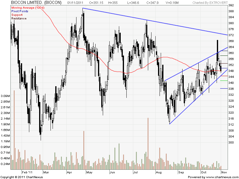 Biocon is trading in a parallel uptrending channel as shown in above chart.Stock did a brief breakout on intraday basis above the channel for a swing high of 369 but unable to sustain above the levels and fell back in channel and trading towards the lower trading range now.