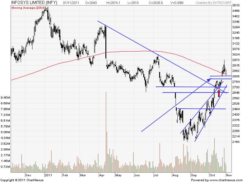 Infosys formed a DOJI candle yesterday 2811 is the most important level to watch as trading below it will make Infy to fill the gap between 2811 and 2780 as pointed out in the chart above. 2818 is 200 DMA for Infy so 2811-2818 becomes important support levels and close below it will be bearish for the stock.