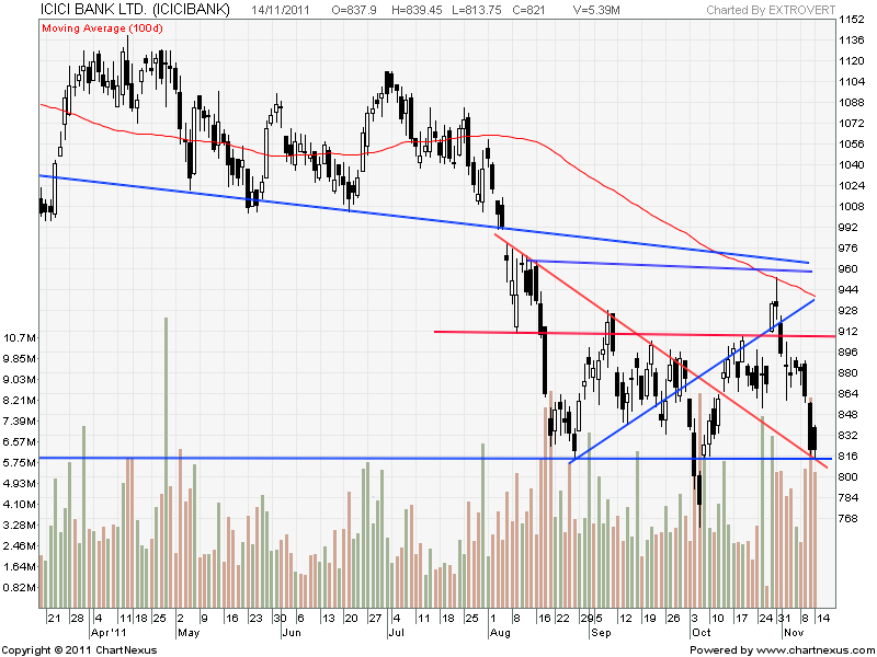 ICICI Bank has been taking support at downward falling trendline, Stock is not going below 812 levels which is an important support in short term support for the stock.