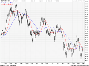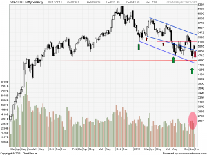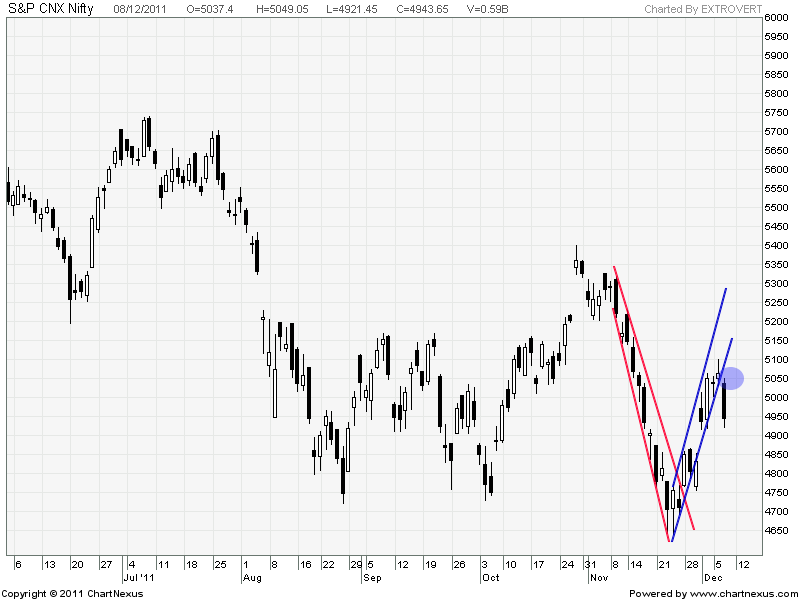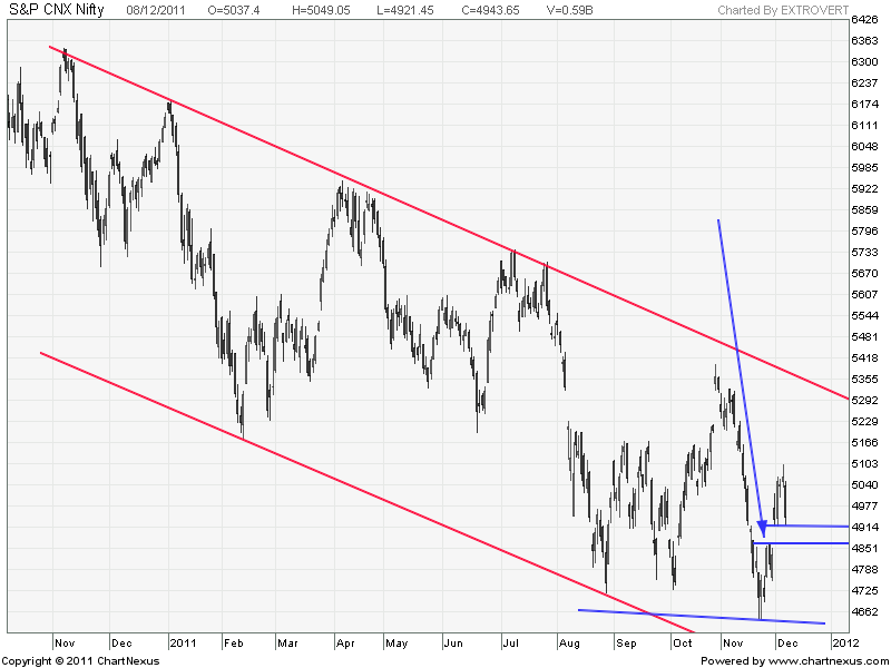 We have broken the upper channel yesterday which means the current upmove is over ie. from 4639-5099 and we have started a new downmove starting yesterday. Till lower lows are getting formed do not think of taking longs in market on positional basis.