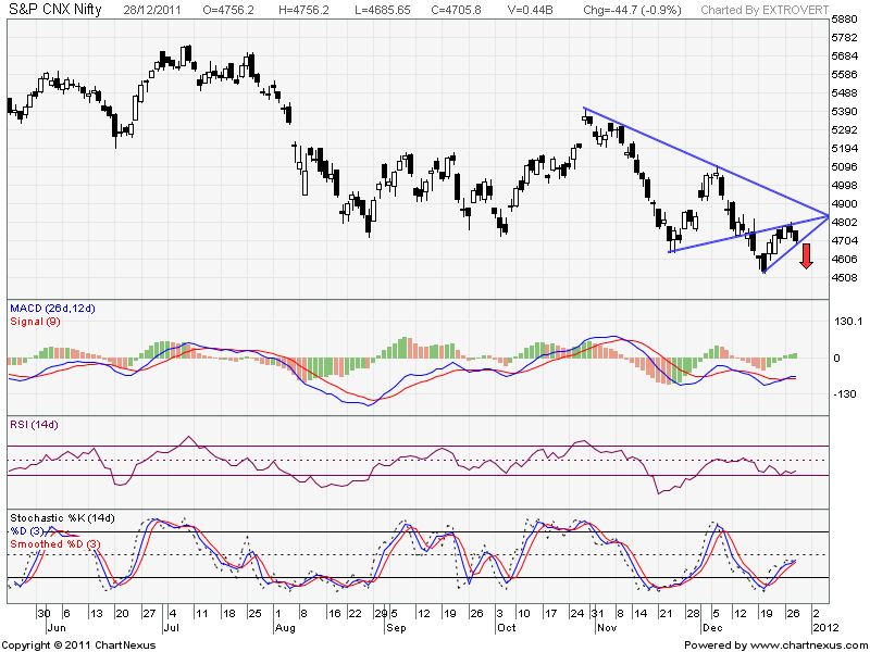 Daily chart nifty has broken the upper channel which gives bearish signal. As i have advocated Nifty is trading in channel from past 3 month as marked in the chart shown above. Also formation of Higher High has stopped as Nifty was unable to cross 4801 yesterday. So things are intretingly poised before the last expiry of 2011.