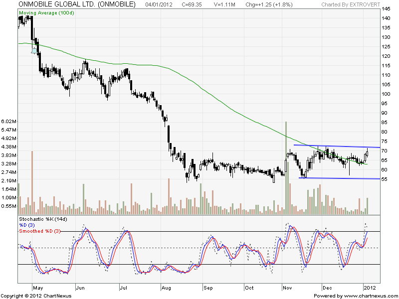 On Mobile Global for 3 day has closed above 100 SMA,Facing resistance in range of 71-72.Crossover of which can bring short term moemtum back into stock