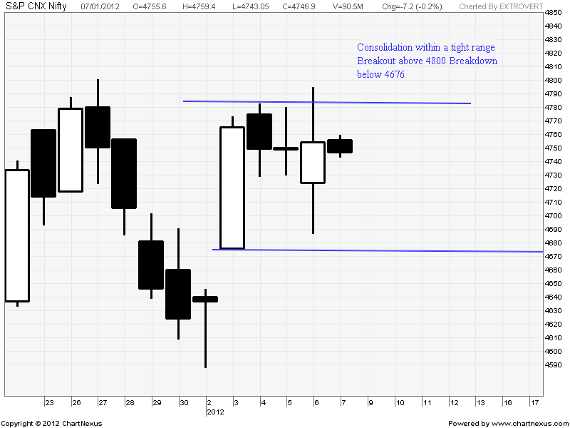 The above charts depecits the tight range Nifty has been trading on past 4 trading session after the rally on 3 Jan. Market did not do anything and preparing base for next move which should be fast and furious. 4800 above breakout and 4676 below breakdown