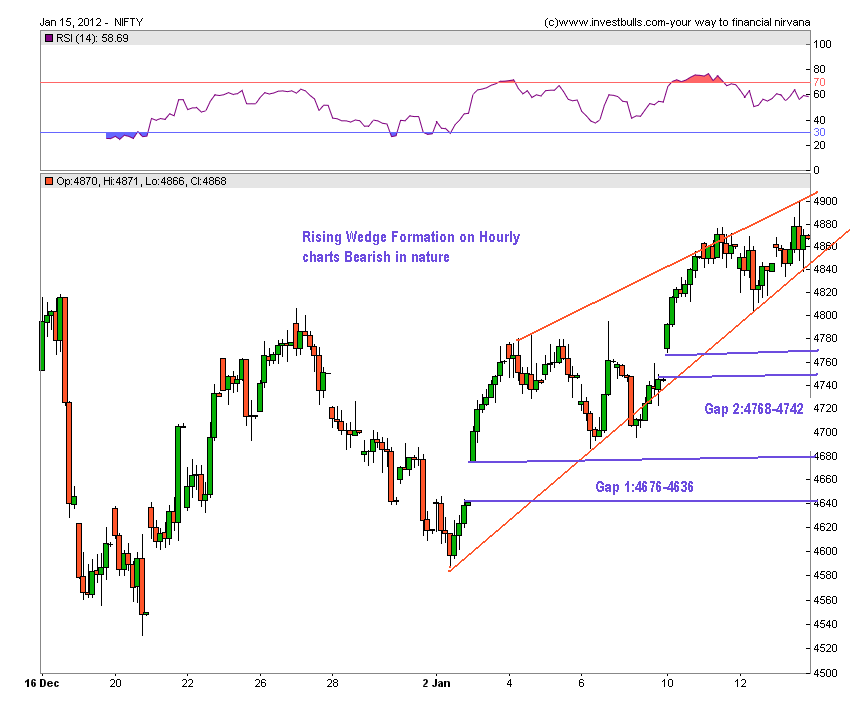 On Hourly chart Nifty is forming Rising Wedge formation which is bearish for short term. 4910 will be the point of invalidation for the rising wedge formation. There is persistent negative divergence on hourly charts. There are 2 Gaps on charts as pointed out in above chart which needs to be watched closely on any downside.