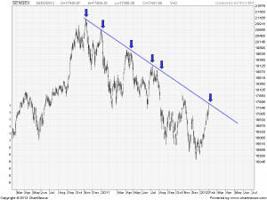 As shown in above chart Sensex has still not shown the channel breakout. Nifty has been doing whipsaw in past but sensex never does so .