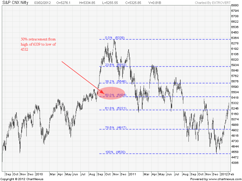 4. :Last condition Index should retrace the 50% fall from the highs. ie From High of 6338 to low of 4532 Nifty should retrace 50% which also comes at 5437. Condition Still not met.