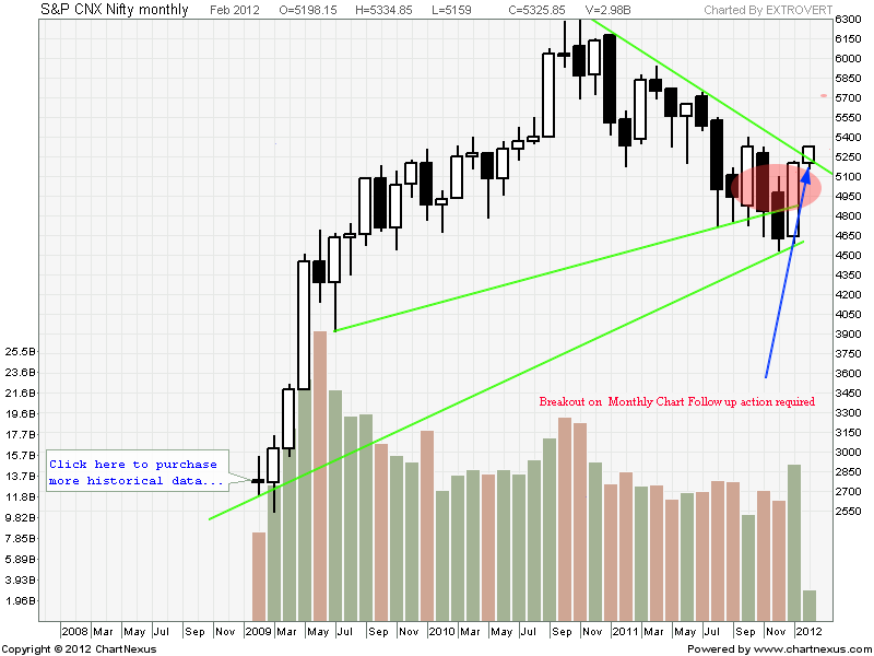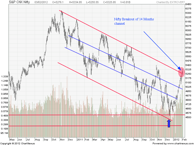 Nifty did a breakout out of 14 months channel which is a bullish signs and much talked about . When a particular things comes in public knowledge markets do give a whipsaws to trap traders . So we will look for confirmation with a weekly closing above breakout level of 5250.