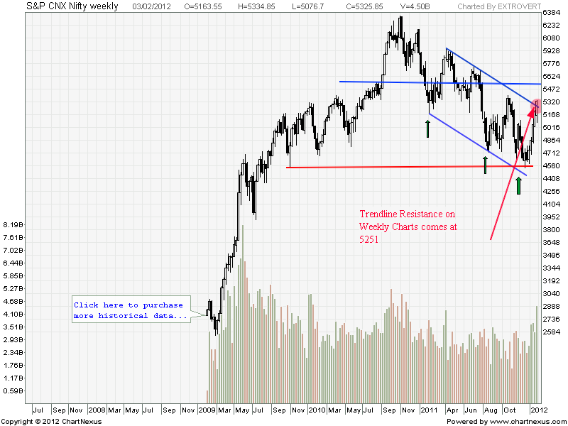 Breakout in Weekly charts as we discussed in last week analysis. 5450 and 5555 are the next level of resistance on weekly charts.Volumes are highest in preceding weeks signifying the breakout backed by volumes.