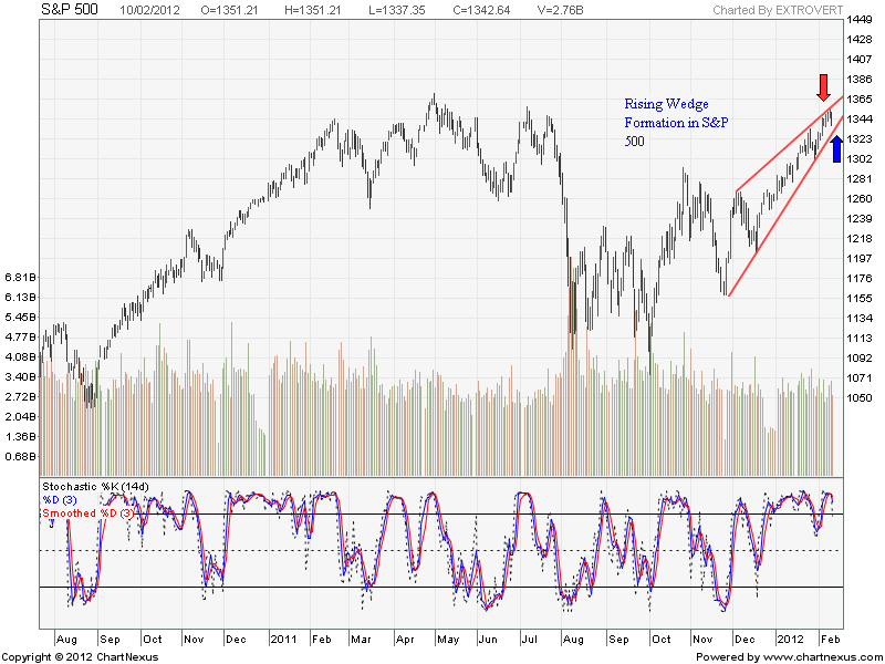 Falling Wedge formation with trendline breakdown below 1326. To be in downward swing S&P 500 should break 1290 on closing basis. It has been 1 way ride for low of 1158 to 1351 without any significant correction.
