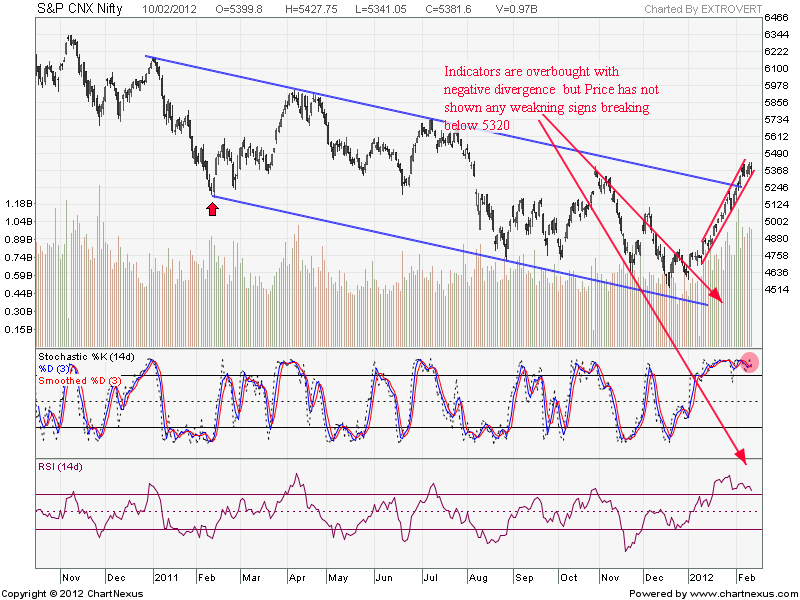 ON daily charts nifty oscillators are overbought and with persistent negative divergence as shown in below chart.But Blindly trading on negative diverge without price confirmation will lead to losses for a trader. Let the price break below 5320 to show the effect of negative divergence.
