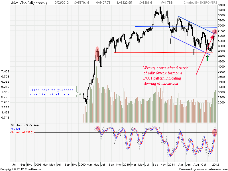 Also When we had the 14 weeks rally in 2009-10 we formed the similar DOJI pattern as marked in above chart and we had the fall in next week. Let see if History Repeat itself?