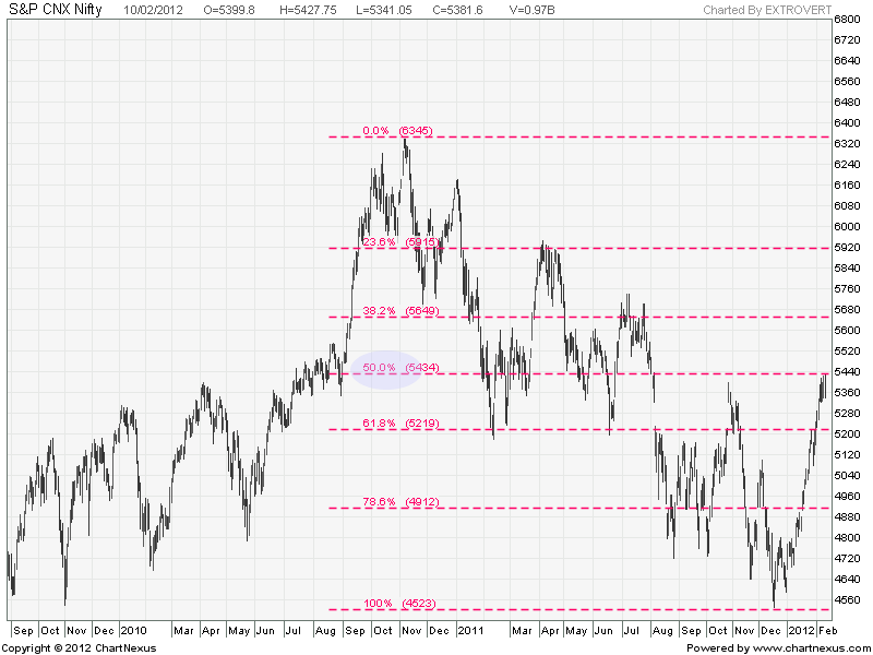 50% fall from the highs. ie From High of 6338 to low of 4532 Nifty should retrace 50% which also comes at 5437,Nifty made a high of 5427 and started the correction.