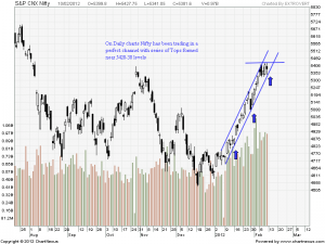 On Daily charts Nifty has been trading in a parallel channel with topping out formation at 5413,5423 and 5428. Supply pressure is coming on upside.