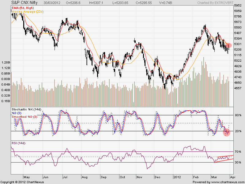 On Daliy chart Nifty closed above 20 SMA@5293 and next formidable resistance comes at 50SMA@5313. So move above 5313 we are in for a rise till 5360-85 range. Close above 50 SMA @5313 will turn the medium term trend from bearish to bullish.