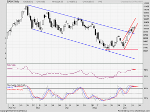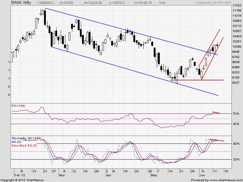 Bank Nifty is showing negative divergence after a 1200 points rally,break of 10000 which is trendline support is important for divergence to show effect.