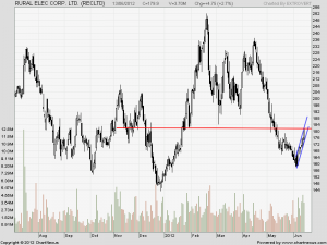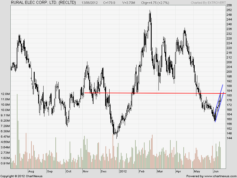 REC was covered here  after the triangle breakout and stock has rallied almost 12% from 160 odd levels. Now stock is at its crucial juncture of 181-182 resistance. Failing to cross the same will lead the stock back to 175-170 odd range.