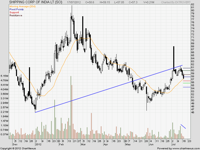 SCI has today made a low of 57.05 which is a strong support, the stock has been declining from past 3 days and volumes are getting reduced on every falling day signalling delivery based selling is not happening.